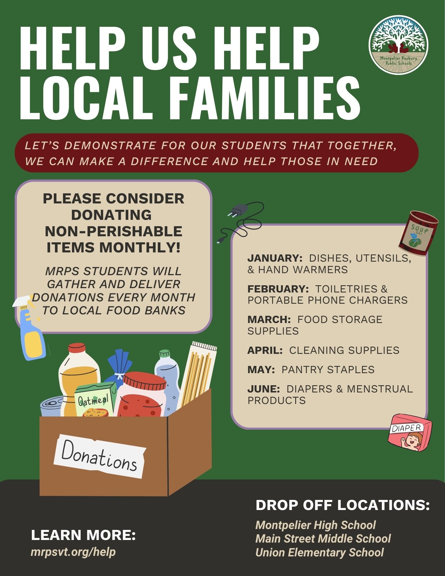 Drop off donations at UES, MSMS, or MHS during the month of January. All donations will go directly to local food banks.